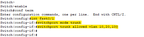 Bu durumda access point cihazlarımızda 10 ve 20 ssid yayınlarımızı oluşturmamız gerekmektedir. Ayrıca cihazın içinden vlan 100’ü de oluşturup ip tanımlamamız gerekmektedir. Cihazlarımız dhcp den ip adresi alıyorsa vlan için sabit ip vermemize gerek yoktur. Bu işlemlerden sonra ap cihazımızın bağlı olduğu portu aşağıdaki gibi yapılandırmamız yeterli olacaktır.